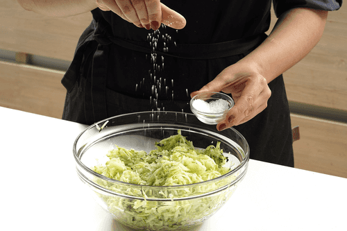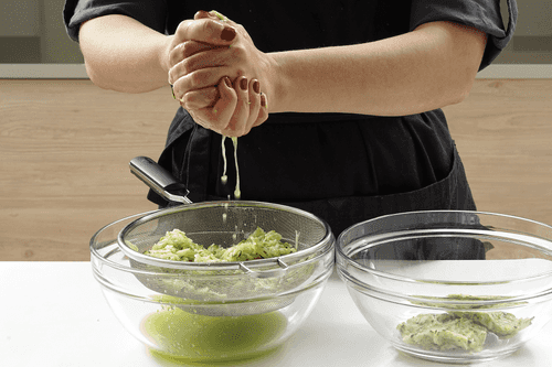 Тщательно отжать кабачки через сито или марлю, чтобы максимально убрать лишний сок.