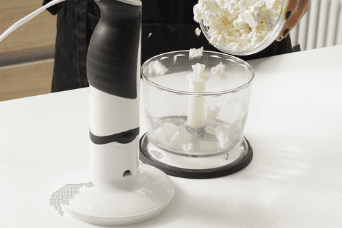Если творог мокрый — отжать его через марлю. Если, наоборот, твердый с крупинками, то измельчить в блендере.