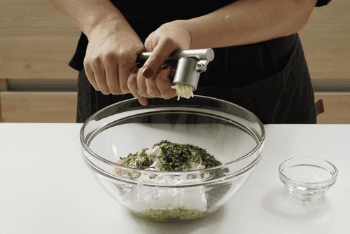 Туда же добавить зелень и пропущенный через пресс чеснок. Перемешать.