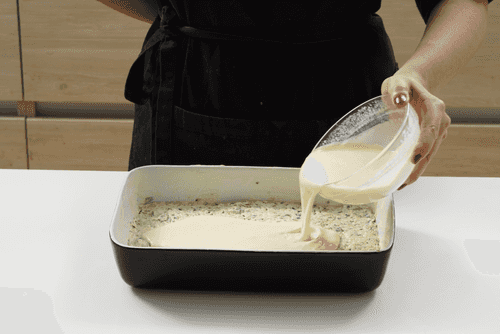 Выложить творожно-кабачковую массу в смазанную сливочным маслом форму, разровнять. Сверху залить сметанную заливку.