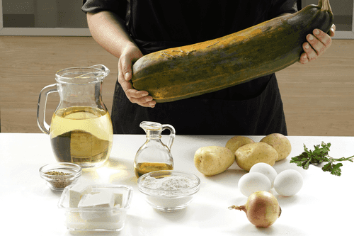 Смешать лук, оливковое масло, яйца, 5 cт.л. муки, рубленую петрушку и орегано. Добавить сыр, еще раз аккуратно перемешать смесь, стараясь его не раздавить.
