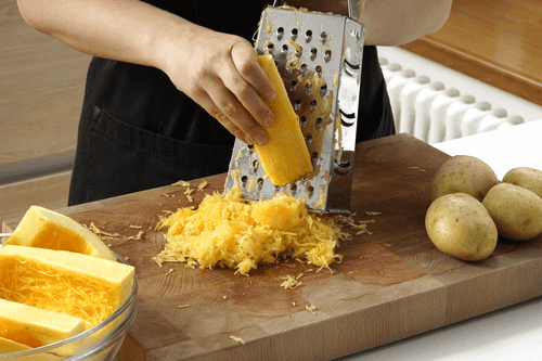 Очистить кабачки, картофель. Натереть на крупной терке.