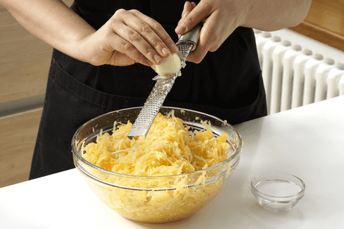 Перемешать натертые кабачки и картофель руками.