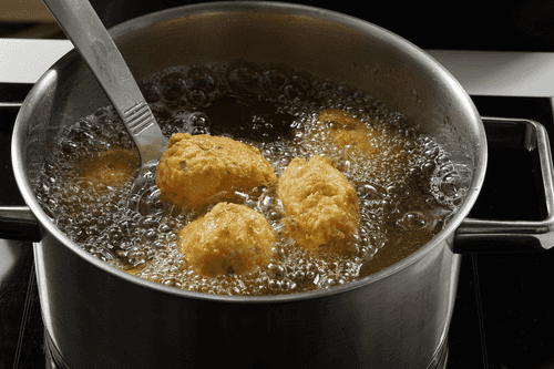 Налить в толстостенную кастрюлю рафинированное масло, разогреть до 180 градусов. Мокрыми руками сформировать из фарша небольшие шарики, обвалять их в муке.
