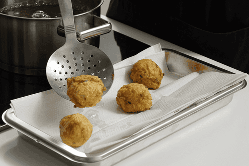 Положить пончики на бумажное полотенце, чтобы стек лишний жир.