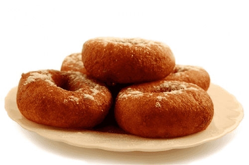 Готовое тесто раскатать толщиной 1/2 см и стаканом или выемкой вырезать кружки. Выемкой меньшего размера из каждого кружка вынуть середину, придавая таким образом тесту форму кольца. Жарить пончики надо в разогретом жире. Готовые пончики посыпать сахарной пудрой.