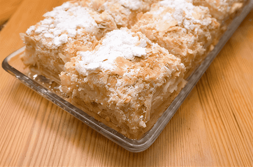Слоеное пирожное с яблоками – это изысканный десерт европейской кухни, сочетающий нежность слоеного теста и освежающий аромат яблочной начинки. Его корни уходят в традиции французской выпечки, где тонкость и воздушность теста ценятся превыше всего. Хрустящая золотистая корочка пирожного скрывает мягкую, сладковато-кисловатую яблочную начинку, приправленную легкими цитрусовыми нотами. Вкус получается гармоничным – насыщенным, но не приторным. Такое пирожное идеально подходит для утреннего чая или в качестве элегантного завершения ужина. Сахарная пудра на поверхности добавляет нотку утонченности, а легкость слоеного теста делает десерт воздушным и приятным. Каждый кусочек – это баланс текстур и вкусов, которые покоряют с первого укуса.