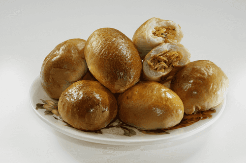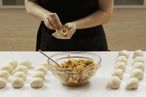Обмять тесто и разделить на 30 частей, сформировать из них шарики. Каждый шарик раскатать, вложить 1 столовую ложку начинки, защепить края.