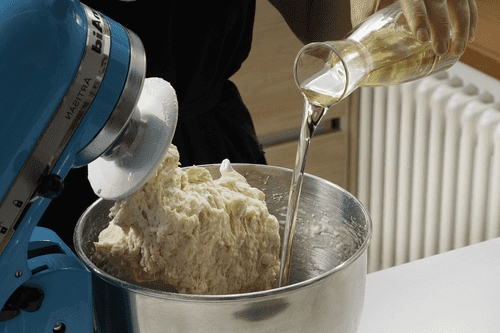 Когда ингредиенты соберутся воедино, добавить 50 мл растительного масла. Продолжать замешивать до тех пор, пока тесто не начнет отставать от стенок миксера.