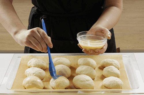 Смешать яйцо и 20 мл молока. Смазать смесью пирожки.