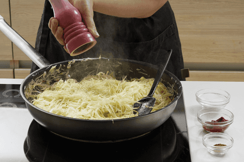Добавить к капусте томатную пасту, молотый кориандр, соль и молотый черный перец по вкусу.