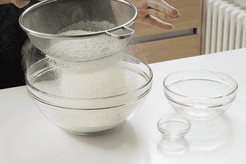 Муку смешать с разрыхлителем и просеять.