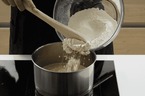 Молоко или воду смешать в сотейнике со сливочным маслом, солью, сахаром (30 г) и довести до кипения. Как только масло разойдется — снять с огня.