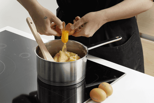 Поставить тесто на самый тихий огонь и начать вмешивать по одному яйца. При этом процесс вымешивания не должен прерываться. Тесто должно получиться гладким, блестящим и без комочков. Как только цель будет достигнута — сразу снять его с огня.
