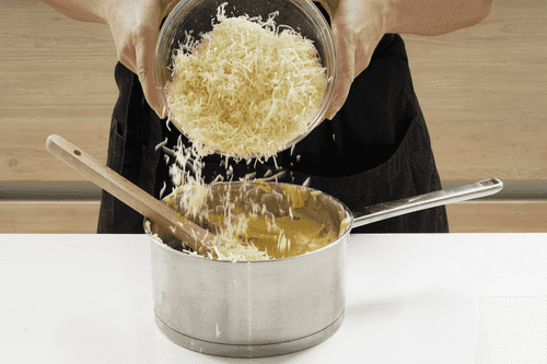Добавить тертый сыр, перемешать, чтобы сыр полностью растворился. Остудить тесто до комнатной температуры.