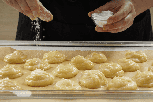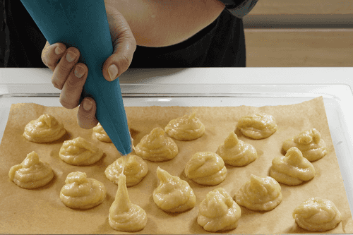 Выстелить противень бумагой для выпечки и при помощи чайной ложки или кондитерского мешка сформировать на нем шарики из теста величиной с грецкий орех на расстоянии 3–4 см друг от друга.