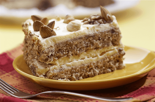Одну лепешку поместить на блюдо, положить на нее слой сливочной массы, разровнять и накрыть второй лепешкой, смазать верх лепешки сливочной массой, обсыпать рубленым, зарумяненным в духовом шкафу миндалем и подать к столу.