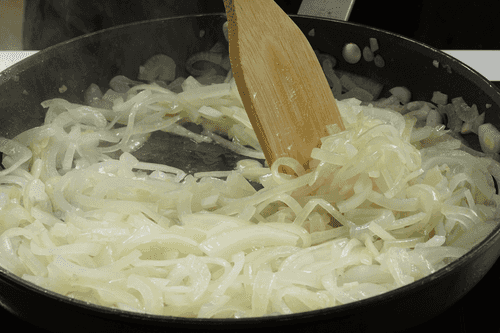 Нарезать лук полукольцами. Потушить его на растительном масле до полупрозрачности.