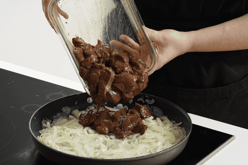 Добавить печень к луку, накрыть крышкой и тушить минут 7–10.