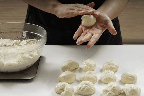 Поделить тесто на шарики одинакового размера. Накрыть шарики пленкой и дать им постоять 10 минут.
