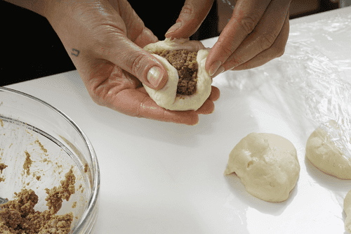 Раскатать шарики. Положить в центр каждого начинку и слепить пирожки.