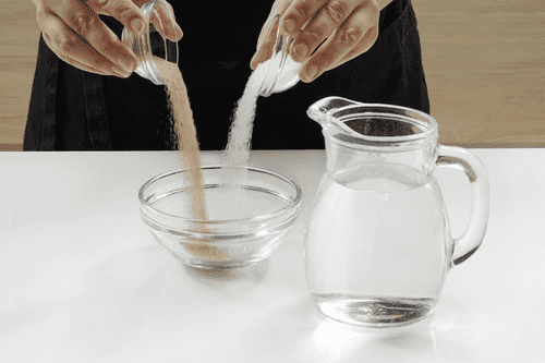 Соединить в миске дрожжи и 1 столовую ложку сахара. Залить небольшим количеством теплой воды и подержать 5 минут.