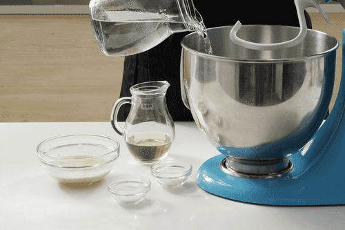 Постепенно добавить в миску муку. Добавлять по 1 стакану, после чего тщательно перемешивать. Или доверить эту работу тестомесу. Если тесто не собирается в шар, добавить еще 2 столовые ложки муки.