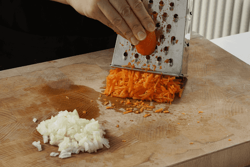 Мелко нарезать репчатый лук. Морковь натереть на крупной терке.