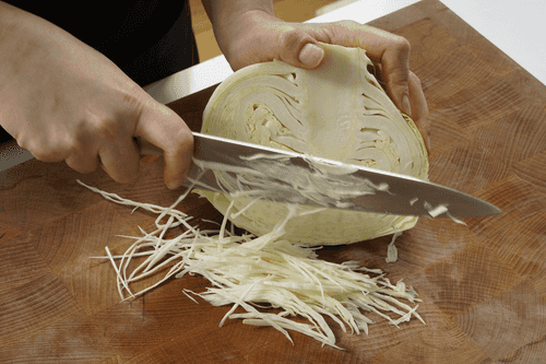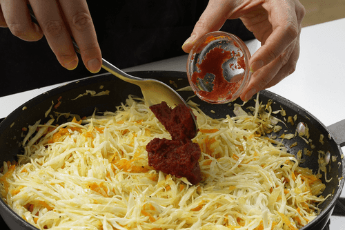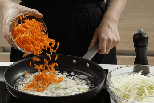 На растительном масле обжарить лук и морковь. Спустя 5 минут добавить к ним капусту. Посолить и поперчить.