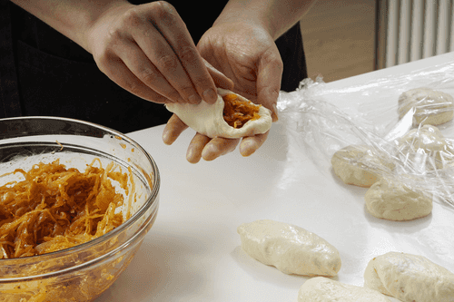 Раскатать шарики. Положить в центр каждого начинку. Слепить пирожки.