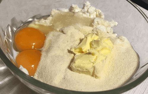 Творог, сахар, яйца, молоко, манку и размягченное сливочное масло (50 г) выложить в чашку и хорошо взбить миксером, чтобы не было комочков.