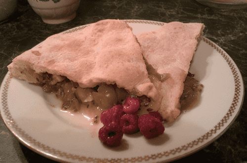 Готовый пирог смазать сливочным маслом и подать к столу с фруктовым соком.