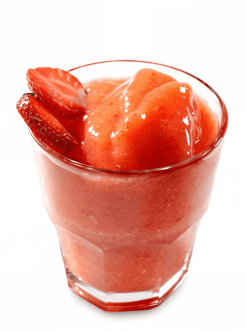 В кухонном комбайне смешать клубнику, предварительно замороженную в течение 2 часов, очищенное и порезанное манго и апельсиновый сок.