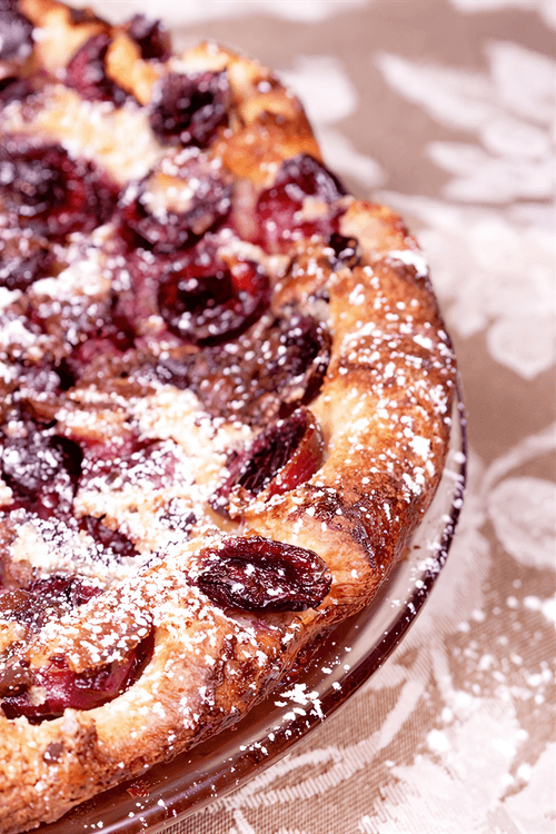 Вишню равномерно полить тестом и запекать 40 минут до бледно-золотистого цвета. Дать остыть до комнатной температуры, посыпать сахарной пудрой и подавать.