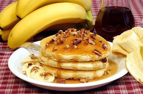 Нарезать бананы на кусочки, поджарить орехи. На тарелку выложить оладьи, прослаивая бананами и орехами. Подавать с кленовым сиропом.