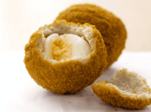 Разогрейте масло на сковороде до 180 градусов. Слегка взбейте яйца в глубокой тарелке, а крошки насыпьте в плоскую посуду. Погружайте яйца с начинкой сначала во взбитое яйцо, а потом в крошки и отправляйте их жариться, лучше частями, пока они не станут золотистыми. Снимайте шумовкой и дайте лишнему маслу обсохнуть на бумажном полотенце. Подавайте сразу с томатным соусом.
