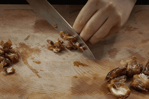 Слить воду, очистить финики от косточки, 8 фиников крупно нарезать.
