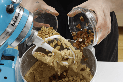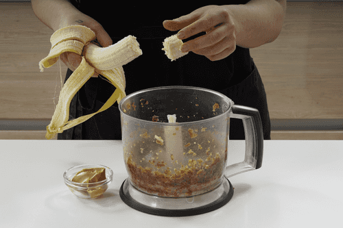 Добавить банан и арахисовую пасту, снова перемешать.