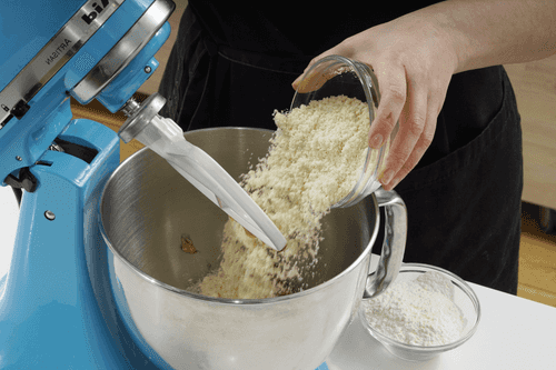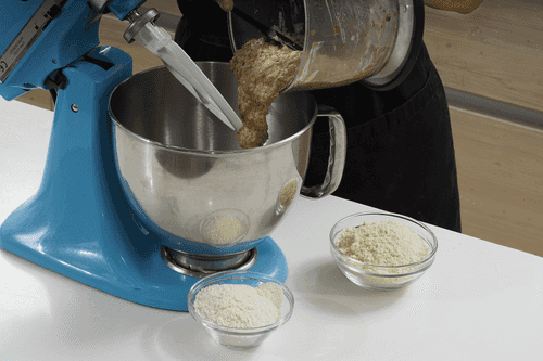 Всыпать оба вида муки и взбивать, пока не получится рыхлое тесто. Если тесто слишком жидкое для формовки, добавить еще немного миндальной или пшеничной муки.