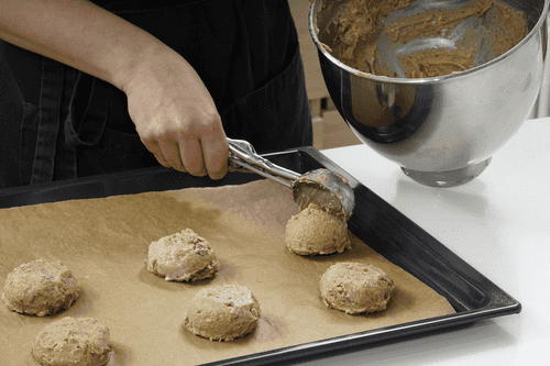 Простелить противень бумагой для выпечки. С помощью столовой ложки сформировать печенья.