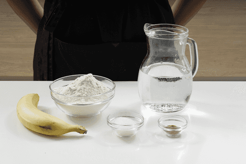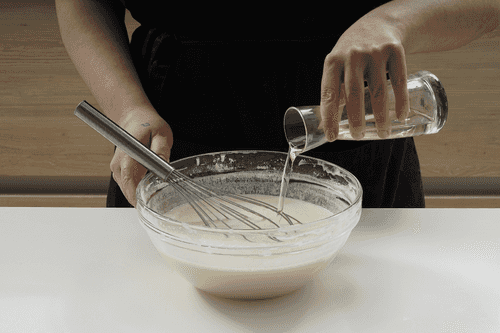 Постепенно, тщательно размешивая тесто большим венчиком, всыпать муку в миску с водой. Должно получиться жидкое тесто однородной консистенции. Если получилось совсем жидко, добавить еще немного муки.