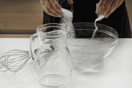В миску влить газировку, всыпать соль, 40 грамм сахара и размешать, пока все не растворится.