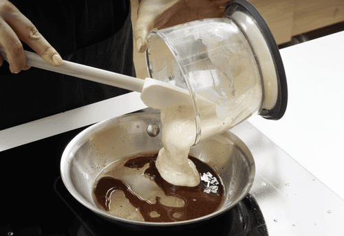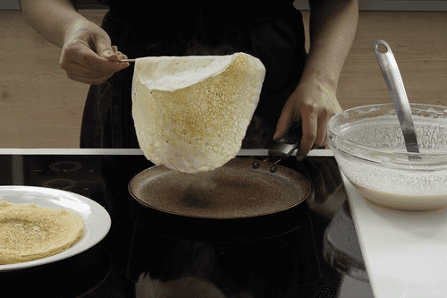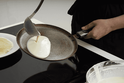 Разогреть сковороду с антипригарным покрытием, смазать ее растительным маслом. Влить на сковороду половник теста и круговыми движениями распределить его.