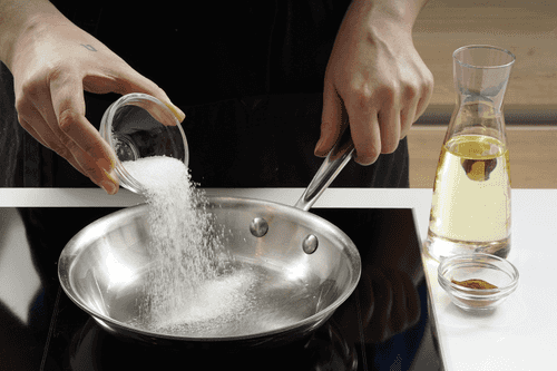 Разогреть в сковороде 3 столовых ложки растительного масла, всыпать оставшийся сахар и корицу. Прогревать, помешивая, пока сахар не растворится.