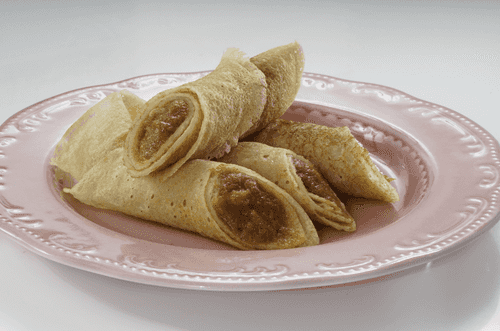В середину каждого блина выложить 1 столовую ложку банановой карамели, свернуть блин рулетом.