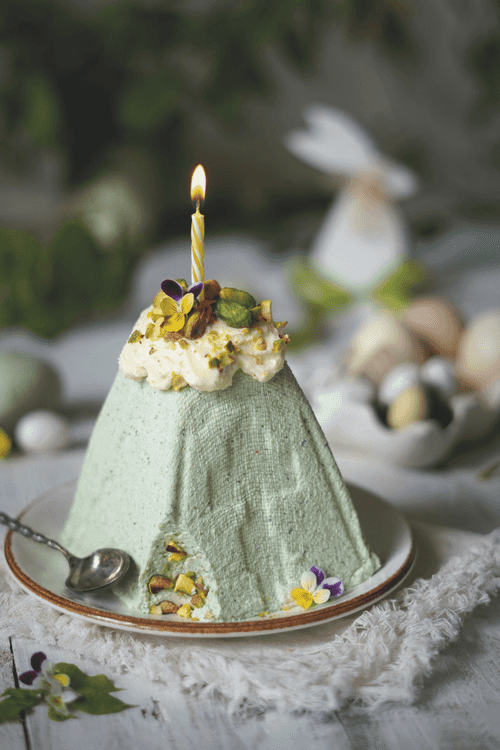 По истечении времени развернуть марлю, поставить сверху плоскую тарелку, на которой вы будете подавать пасху. Перевернуть. Снять пасочницу, украсить заварным кремом и нарубленными фисташками.