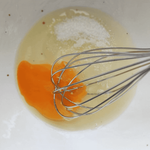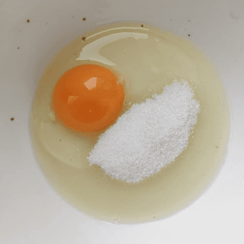 В глубокой миске соединить куриное яйцо, сахар и ванильный сахар.