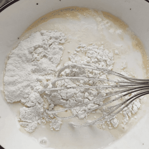 Просеять муку и постепенно вводить ее в кефирную смесь. Муки может понадобиться чуть больше или меньше. Консистенция должна получиться средней густоты.
