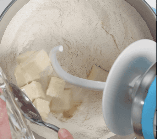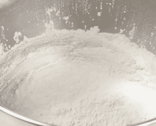 Смешать в деже муку, сахар и соль насадкой крюк.
