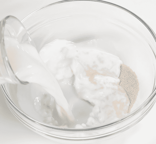 В отдельной миске смешать 230 мл теплого молока и дрожжи. Оставить на 10 минут.